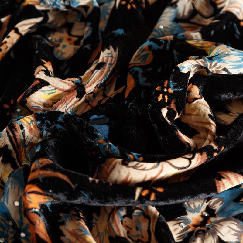 Итальянский бархат с цветочным принтом и стразами. Ткань легкая, пластичная, мягкая, с коротким и блестящим ворсом, имеющим направление, очень приятная на ощупь, прекрасно драпируется. Подойдет для платья, юбки, туники, блузки, комбинезона, свободных брюк и костюма свободного кроя.