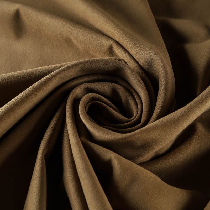 Хлопковый итальянский бархат благородного табачного цвета с оливковым нюансом. Ткань плотная, мягкая с коротким ворсом. Не грубая, хорошо драпируется. Имеет благородный матовый оттенок. Подойдет для пошива нарядного костюма, жакета, юбки, жилета, шорт, комбинезонов, брюк, платья-футляр, легкого пальто или бомбера.