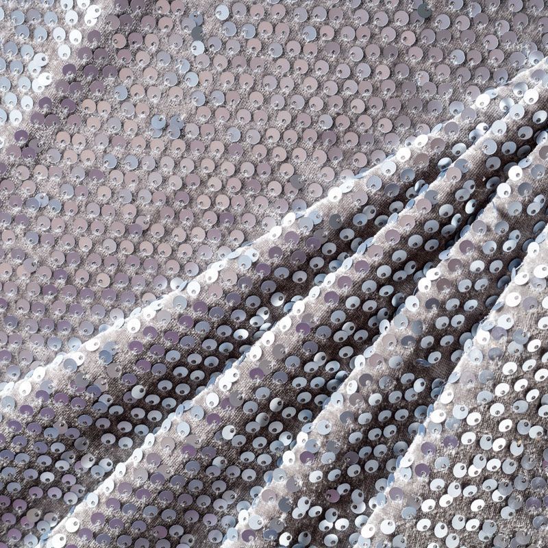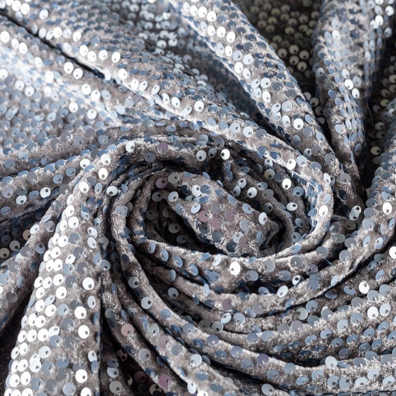Бархатное полотно на трикотажной основе благородного серебристо-серого оттенка. По всей поверхности ткань усеяна матовыми пайетками, которые очень деликатно отражают свет. Бархат достаточно тонкий и пластичный, прекрасно драпируется и укладывается в складки. Пайетки на бархате эффектно смотрятся в виде широких оборок и воланов, юбок прямого силуэта, свободных платьев-балахонов, курток, бомберов и топов с напусками.