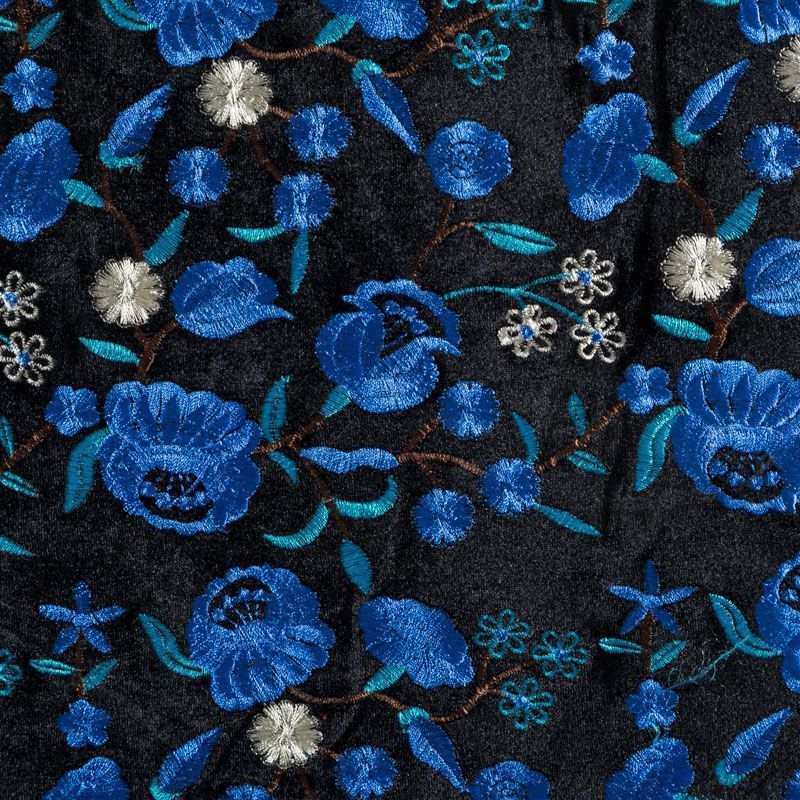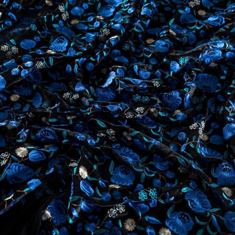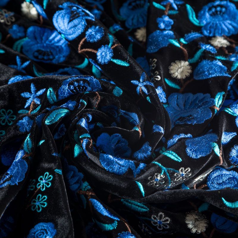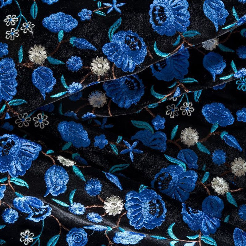 Итальянский бархат черного цвета, декорирован вышивкой фантазийными цветами в голубых оттенках, расположенной по всему полотну.  Ткань приятная на ощупь, хорошо драпируется и держит форму, обладает благородным блеском, тянется за счет эластана в составе. Прекрасно подойдет для жакета, юбки, костюма, жилета, платья.