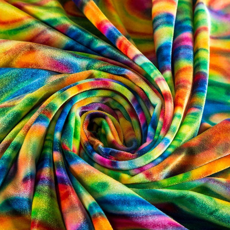 Пластичный, мягкий бархат с абстрактным дизайном в желтых, оранжевых, синих и зеленых оттенках. Ткань очень приятна на ощупь, не мнется, хорошо тянется за счет эластана в составе и драпируется. Цвет играет отблесками и полутонами. Бархат идеально подходит для пошива вечерних платьев, юбок, костюмов, а также стильных аксессуаров.