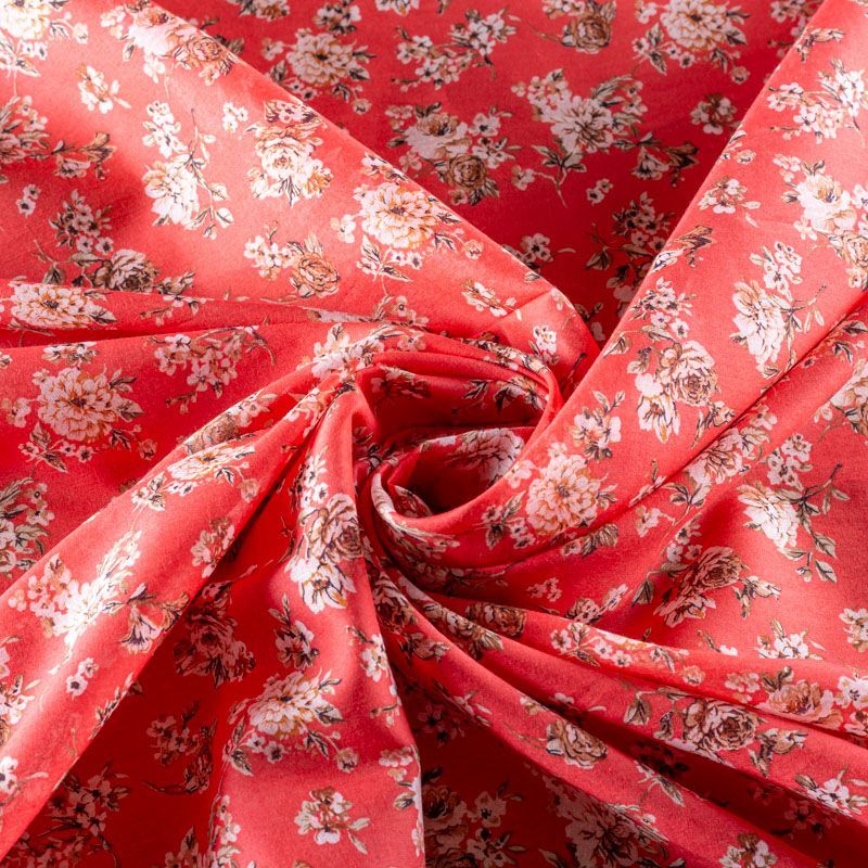 Итальянский хлопковый батист с мелким цветочным принтом в бежево-коричневых оттенках на коралловом фоне. Ткань очень легкая, прозрачная, приятная на ощупь, нежная, пластичная, хорошо и мягко драпируется, летящая. Батист подойдёт для модных блуз с объёмными рукавами, летних платьев и сарафанов с длинной летящей юбкой, прозрачных рубашек, декорированных объёмными бантами, туник и топов.