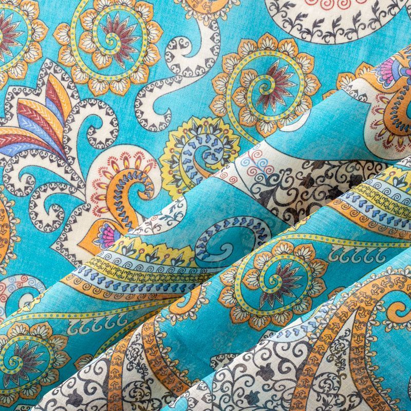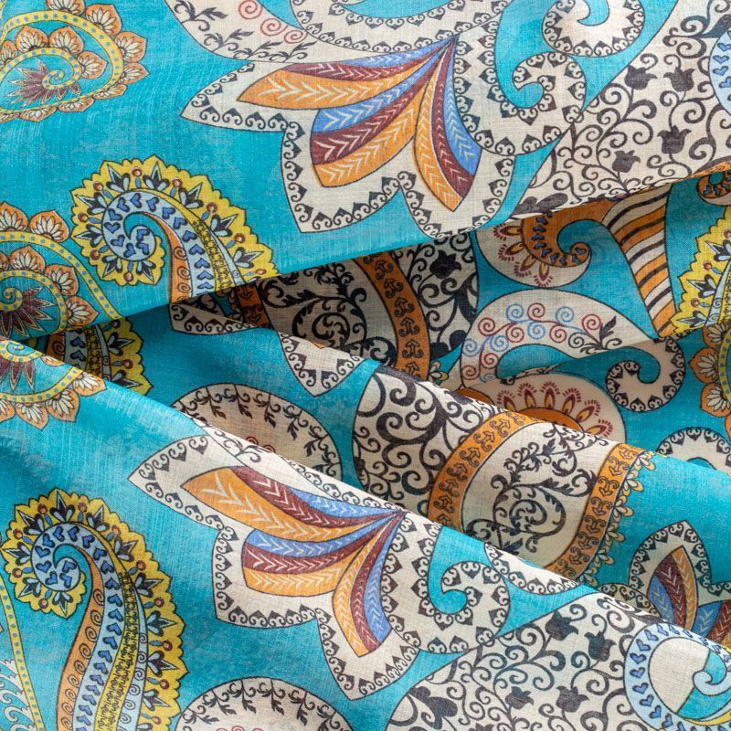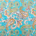 Батист с цветным принтом пейсли в молочно-коричневых оттенках на бирюзовом фоне. Ткань очень легкая, прозрачная, приятная на ощупь, нежная, пластичная, хорошо и мягко драпируется, летящая. Батист подойдёт для модных блуз с объёмными рукавами, летних платьев и сарафанов с длинной летящей юбкой, прозрачных рубашек, декорированных объёмными бантами, туник и топов.
