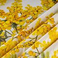 Ткань прозрачная, приятная на ощупь, нежная, хорошо и мягко драпируется, летящая. Хлопковый батист подойдёт для модных блуз с объёмными рукавами, летних платьев и сарафанов с длинной летящей юбкой, прозрачных рубашек, декорированных объёмными бантами. Яркий весенний принт в виде веток цветущей мимозы в солнечно желтых и зеленых оттенках на молочном фоне.