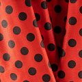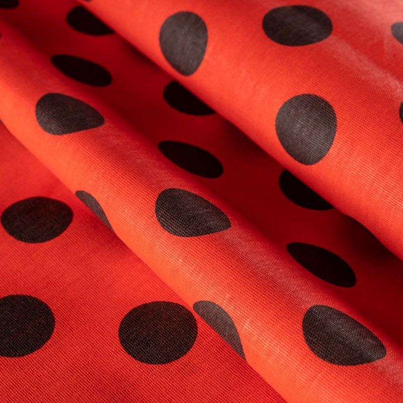 Плотная натуральная ткань с особым принципом переплетения нитей: крест-накрест. Имеет гладкую матовую поверхность чуть шероховатую на ощупь, не тянется, немного просвечивает. Прочная и стойкая к износу, надолго сохраняет яркость красок, не растягивается при стирке, практически не мнется. Черный крупный горох (2,5 см) на ярком красном фоне имитирует окрас божьей коровки и прекрасно подойдет для пошива постельного белья, изготовления пеленок, бортиков для кроватки, домашней одежды и других предметов интерьера.