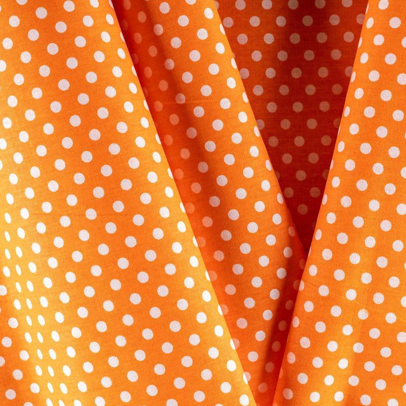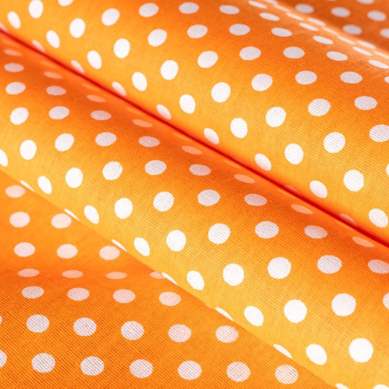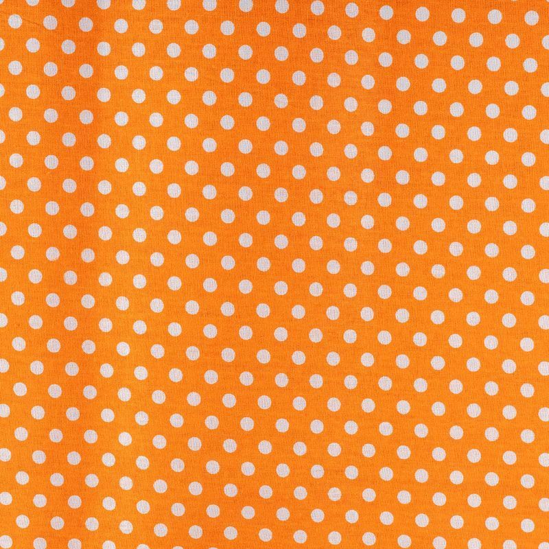 Плотная натуральная ткань с особым принципом переплетения нитей: крест-накрест. Имеет гладкую матовую поверхность чуть шероховатую на ощупь, не тянется, немного просвечивает. Прочная и стойкая к износу, надолго сохраняет яркость красок, не растягивается при стирке, практически не мнется. Мелкий белый горошек (5 мм) на сочном оранжевом фоне прекрасно подойдет для пошива постельного белья, изготовления пеленок, бортиков для кроватки, домашней одежды и других предметов интерьера.
