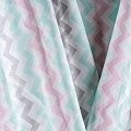 Плотная натуральная ткань с особым принципом переплетения нитей: крест-накрест. Имеет гладкую матовую поверхность чуть шероховатую на ощупь, не тянется, немного просвечивает. Прочная и стойкая к износу, надолго сохраняет яркость красок, не растягивается при стирке, практически не мнется. Нежный принт в пастельных тонах в виде зигзага на белом фоне прекрасно подойдет для пошива постельного белья, изготовления пеленок, бортиков для кроватки и других предметов домашней одежды и интерьера.