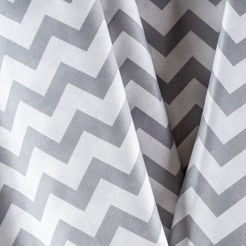 Плотная натуральная ткань с особым принципом переплетения нитей: крест-накрест. Имеет гладкую матовую поверхность чуть шероховатую на ощупь, не тянется, немного просвечивает. Прочная и стойкая к износу, надолго сохраняет яркость красок, не растягивается при стирке, практически не мнется. Принт в виде чередующихся полос белого и серого цвета в форме зигзага прекрасно подойдет для пошива постельного белья, изготовления пеленок, бортиков для кроватки и других предметов домашней одежды и интерьера.