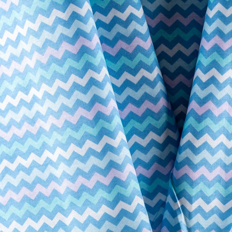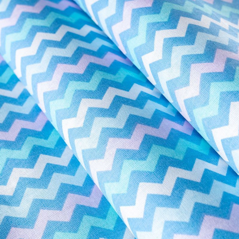 Плотная натуральная ткань с особым принципом переплетения нитей: крест-накрест. Имеет гладкую матовую поверхность чуть шероховатую на ощупь, не тянется, немного просвечивает. Прочная и стойкая к износу, надолго сохраняет яркость красок, не растягивается при стирке, практически не мнется. Цветной принт в виде чередующихся полос в форме зигзага на белом фоне прекрасно подойдет для пошива постельного белья, изготовления пеленок, бортиков для кроватки и других предметов домашней одежды и интерьера.