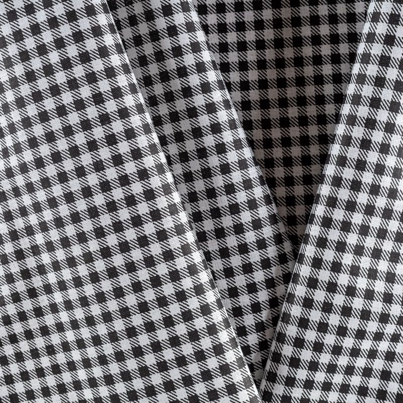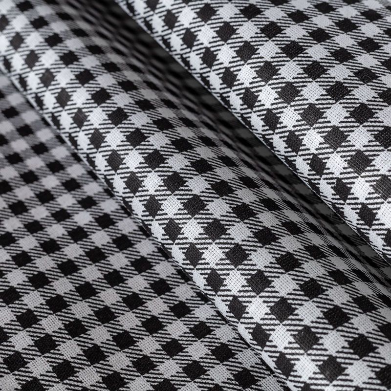 Плотная натуральная ткань с особым принципом переплетения нитей: крест-накрест. Имеет гладкую матовую поверхность чуть шероховатую на ощупь, не тянется, немного просвечивает. Прочная и стойкая к износу, надолго сохраняет яркость красок, не растягивается при стирке, практически не мнется. Рисунок в мелкую клеточку черного цвета на белом фоне прекрасно подойдет для пошива постельного белья, изготовления пеленок, бортиков для кроватки, домашней одежды и других предметов интерьера.