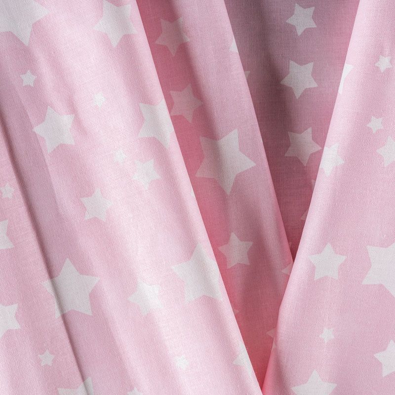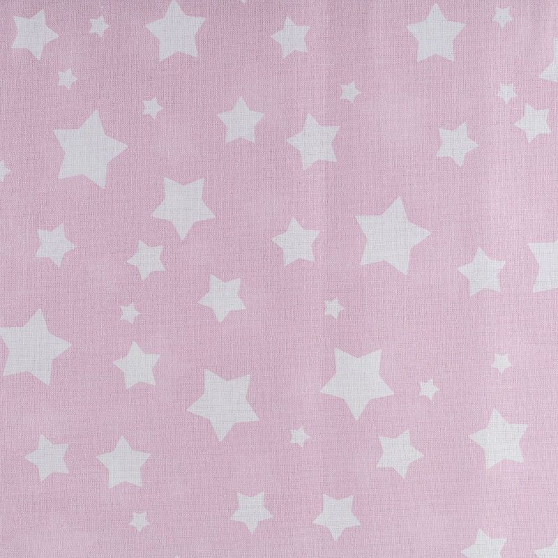 Плотная натуральная ткань с особым принципом переплетения нитей: крест-накрест. Имеет гладкую матовую поверхность чуть шероховатую на ощупь, не тянется, немного просвечивает. Прочная и стойкая к износу, надолго сохраняет яркость красок, не растягивается при стирке, практически не мнется. Принт в виде  белых звездочек разного размера на нежном розовом фоне прекрасно подойдет для пошива постельного белья, изготовления пеленок, бортиков для кроватки, домашней одежды и других предметов интерьера.
