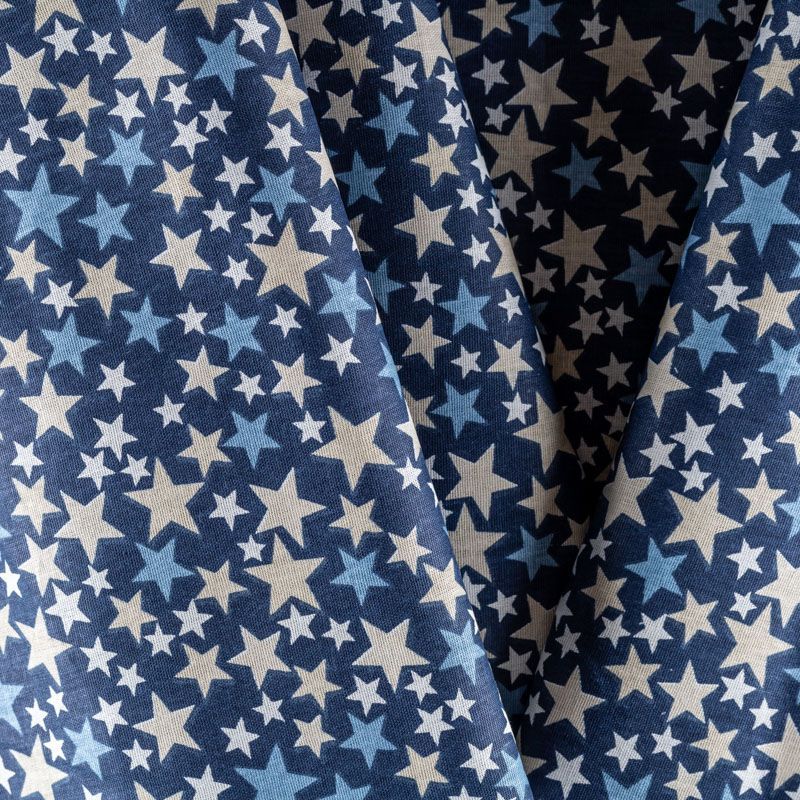 Плотная натуральная ткань с особым принципом переплетения нитей: крест-накрест. Имеет гладкую матовую поверхность чуть шероховатую на ощупь, не тянется, немного просвечивает. Прочная и стойкая к износу, надолго сохраняет яркость красок, не растягивается при стирке, практически не мнется. Принт в виде цветных звездочек разного размера на темно-синем фоне прекрасно подойдет для пошива постельного белья, изготовления пеленок, бортиков для кроватки, домашней одежды и других предметов интерьера.