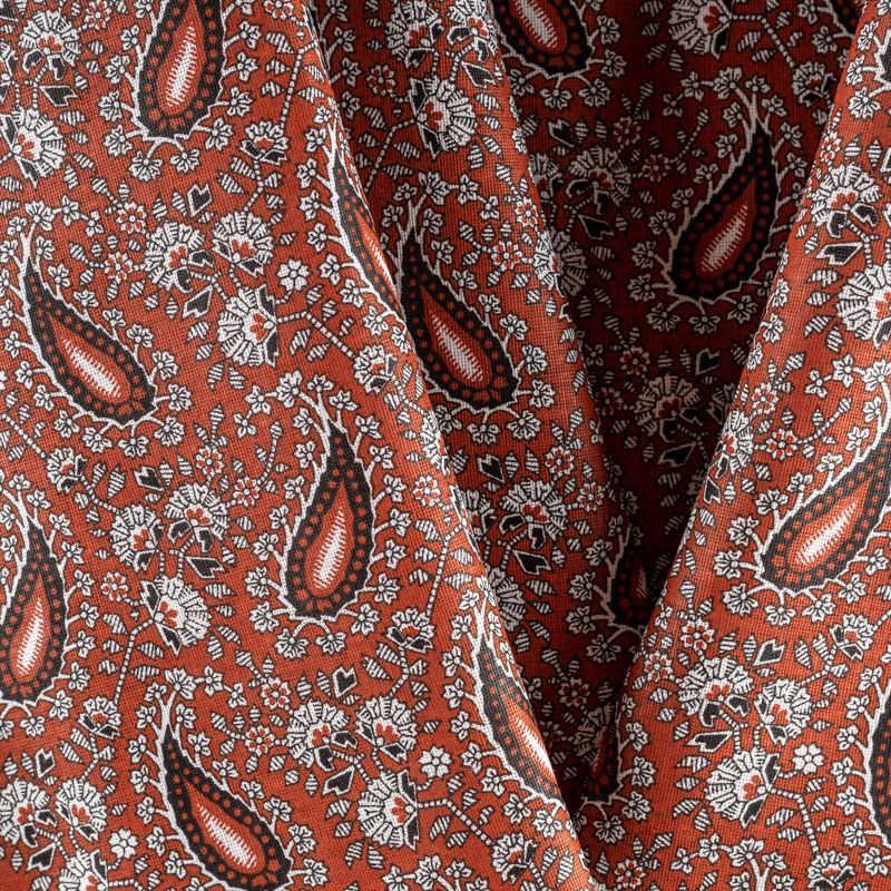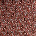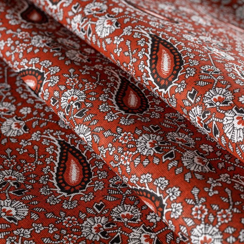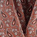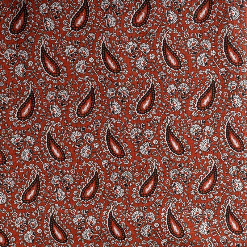 Плотная натуральная ткань с особым принципом переплетения нитей: крест-накрест. Имеет гладкую матовую поверхность, немного шероховатая на ощупь, не тянется, немного просвечивает. Прочная и стойкая к износу, надолго сохраняет яркость красок, практически не мнется. Восточный принт пейсли на сложном фоне медно-бордового оттенка прекрасно подойдет для пошива постельного и столового белья, изготовления домашней одежды и других предметов интерьера.