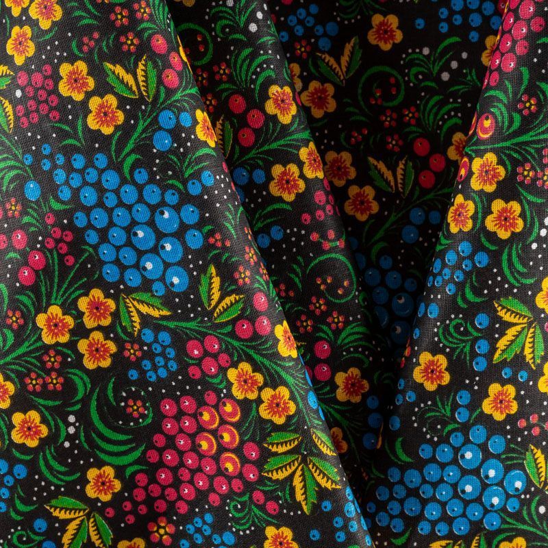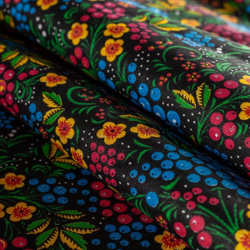 Плотная натуральная ткань с особым принципом переплетения нитей: крест-накрест. Имеет гладкую матовую поверхность, немного шероховатая на ощупь, не тянется, немного просвечивает. Прочная и стойкая к износу, надолго сохраняет яркость красок, практически не мнется. Мелкий цветной растительный принт на черном фоне прекрасно подойдет для пошива постельного и столового белья, изготовления сценических костюмов, домашней одежды и других предметов интерьера.