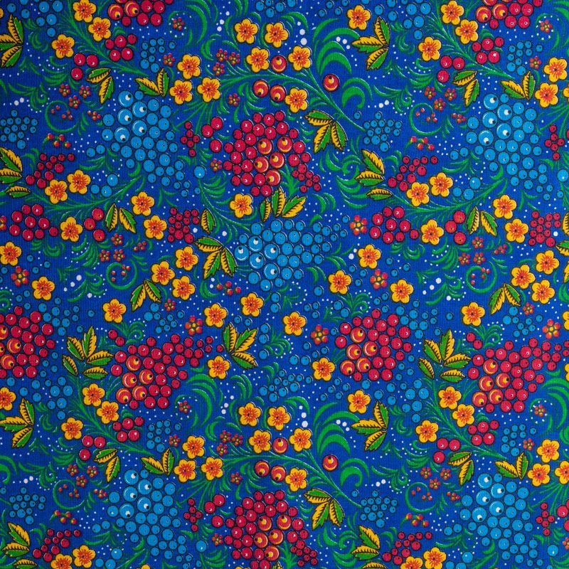 Плотная натуральная ткань с особым принципом переплетения нитей: крест-накрест. Имеет гладкую матовую поверхность, немного шероховатая на ощупь, не тянется, немного просвечивает. Прочная и стойкая к износу, надолго сохраняет яркость красок, практически не мнется. Мелкий цветной растительный принт на васильковом фоне прекрасно подойдет для пошива постельного и столового белья, изготовления сценических костюмов, домашней одежды и других предметов интерьера.