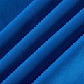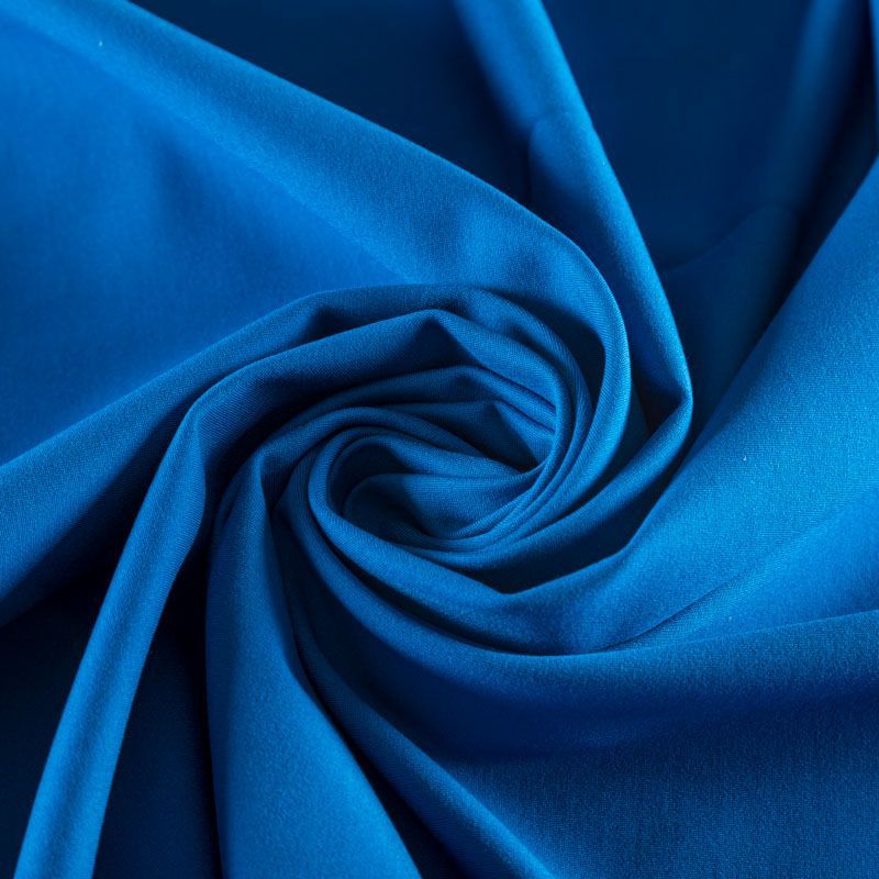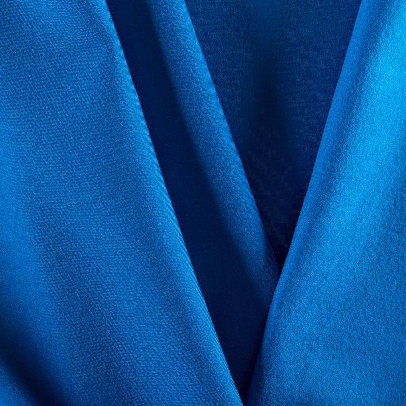 Эластичный, плотный хлопковый трикотаж василькового оттенка. Поверхность ткани гладкая и матовая, с изнанки - с шелковистым мягким ворсом.  Материал упругий, имеет растяжимость по всем сторонам, не просвечивается, хорошо держит форму, уютный, приятный к телу и удобный в носке. Применяется в пошиве костюмов, жакетов, кардиганов, платьев и юбок.