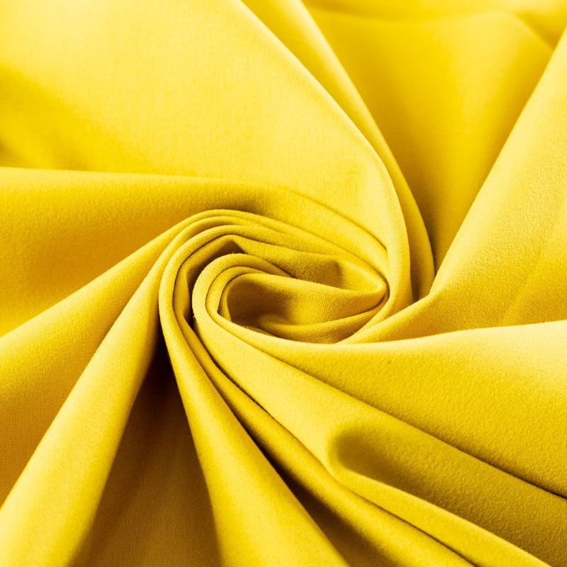 Эластичный, плотный хлопковый трикотаж оливкового оттенка с золотистым подтоном. Поверхность ткани гладкая и матовая, с изнанки - с шелковистым мягким ворсом.  Материал упругий, имеет растяжимость по всем сторонам, не просвечивается, хорошо держит форму, уютный, приятный к телу и удобный в носке. Применяется в пошиве костюмов, жакетов, кардиганов, платьев и юбок.