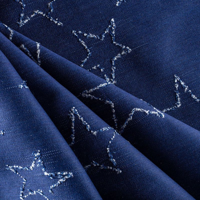 Плотная джинсовая ткань классического синего оттенка с жаккардовым узором в виде звезд. Ткань имеет диагональное плетение, не большую толщину, мягкая и приятная на ощупь, тянется за счет