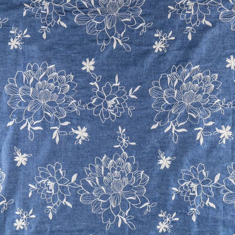 На сине-голубом фоне цветы, вышитые белой нитью со сдержанным атласным блеском. Полотно легкое, средней плотности, очень пластичное, не держит форму. Материал отлично драпируется, формируя мягкие складки. Подойдет для прямых, расклешенных платьев, сарафанов, платья-рубашки, юбки или туники.