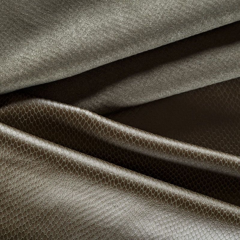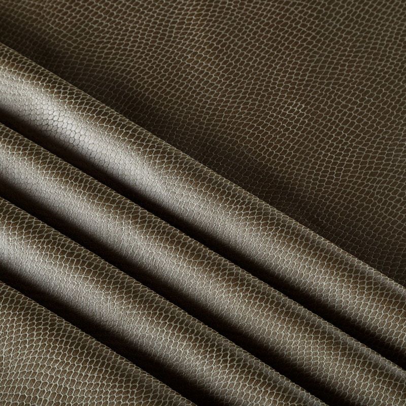 Искусственный материал, имитирующий рисунок змеиной кожи оливково-зеленого оттенка на лицевой стороне и замши на изнаночной. Приятная и мягкая на ощупь, тянется за счет эластана в составе, не просвечивает, пластичная, хорошо драпируется. Подойдет для пошива куртки, костюма, платья, юбки, брюк, шорт, комбинезона, сумки, рюкзака.