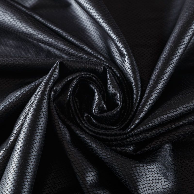 Искусственный материал, имитирующий рисунок змеиной кожи черного цвета на лицевой стороне и черной замши на изнаночной. Приятная и мягкая на ощупь, тянется за счет эластана в составе, не просвечивает, пластичная, хорошо драпируется. Подойдет для пошива куртки, костюма, платья, юбки, брюк, шорт, комбинезона, сумки, рюкзака.