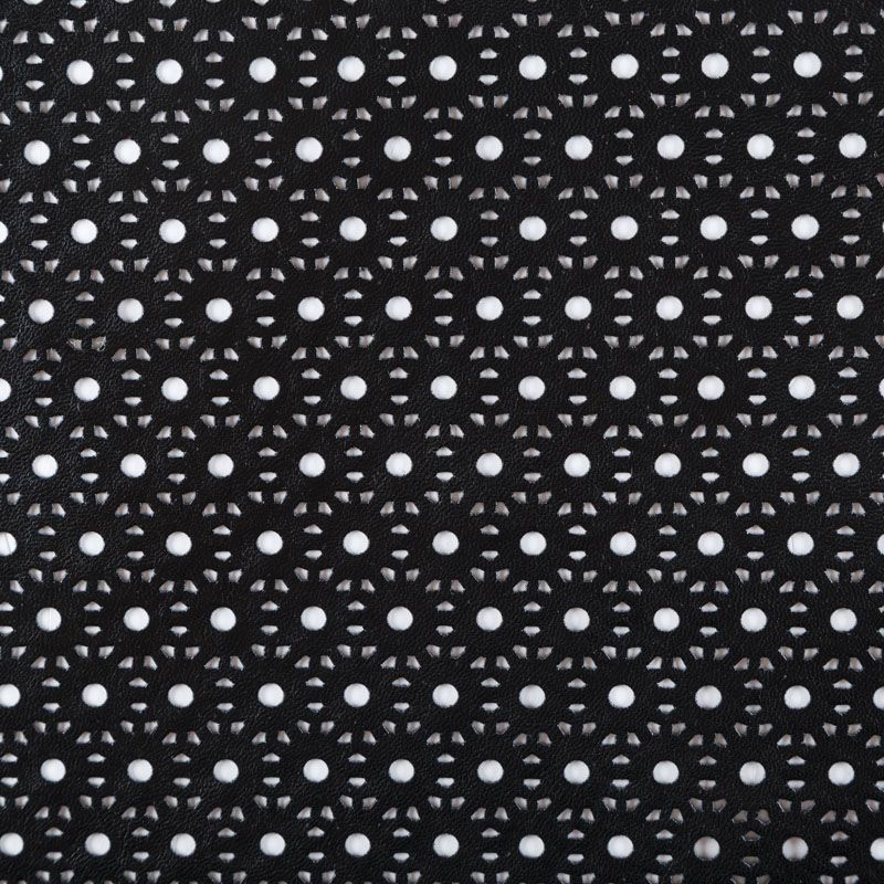 Искусственный материал, имитирующий натуральную кожу, на трикотажной основе. Поверхность матовая, с геометрической лазерной перфорацией. Экокожа тоньше натуральной, не мнется, пластична, тянется, хорошо облегает фигуру. Изнаночная сторона - черный трикотаж. Подойдет для пошива куртки, костюма, платья, юбки, брюк, шорт, комбинезона, сумки, рюкзака.