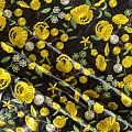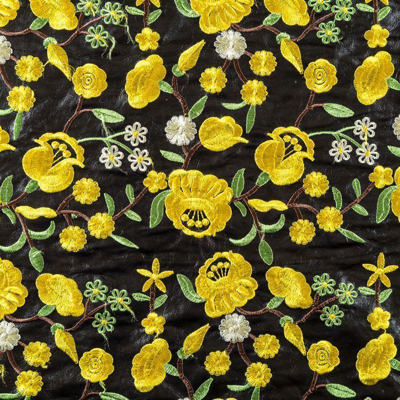 Искусственный материал, имитирующий натуральную кожу черного цвета с богатой объемной цветочной вышивкой в желтых оттенках. Поверхность ткани полуматовая, гладкая. Приятная на ощупь, держит форму, не просвечивает, пластичная. Подойдет для пошива куртки, костюма, платья, юбки, брюк, шорт, комбинезона, сумки, рюкзака.