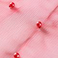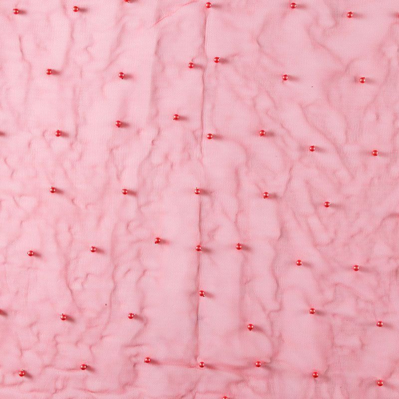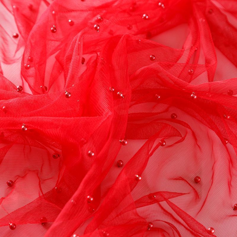 Тонкая прозрачная сетка средней жесткости красного оттенка декорирована не крупными бусинами в тон полотна. Используется для пошива одежды для различных праздников, концертов, пышных юбок, платьев, а также для отделки и украшения, создания предметов декора и украшения помещений для торжественных мероприятий.