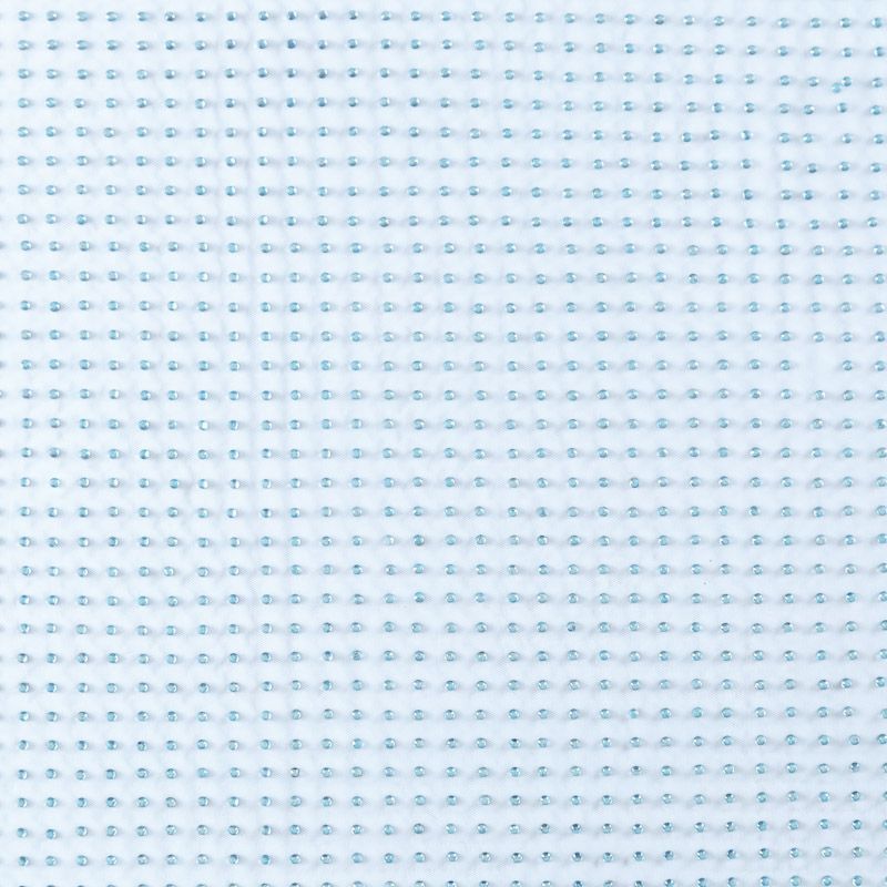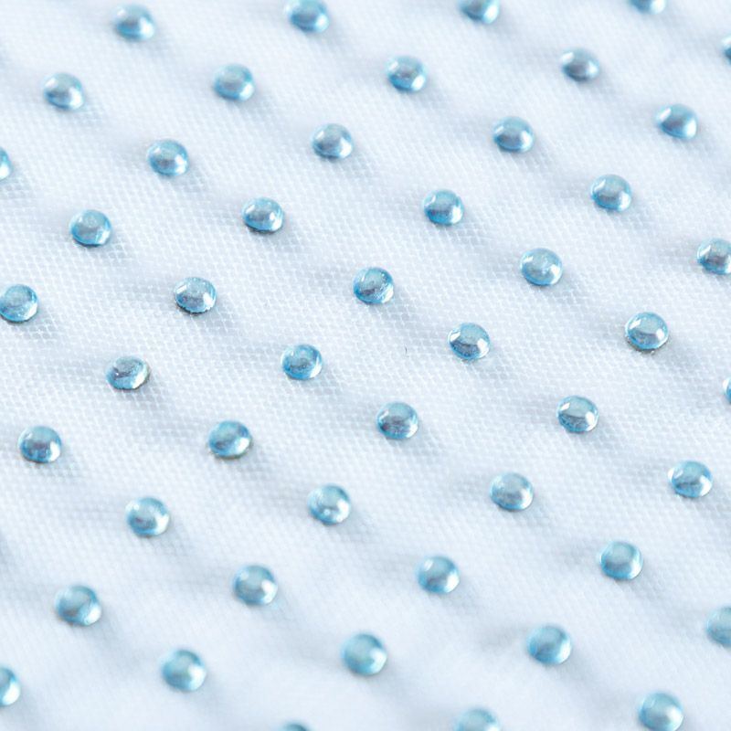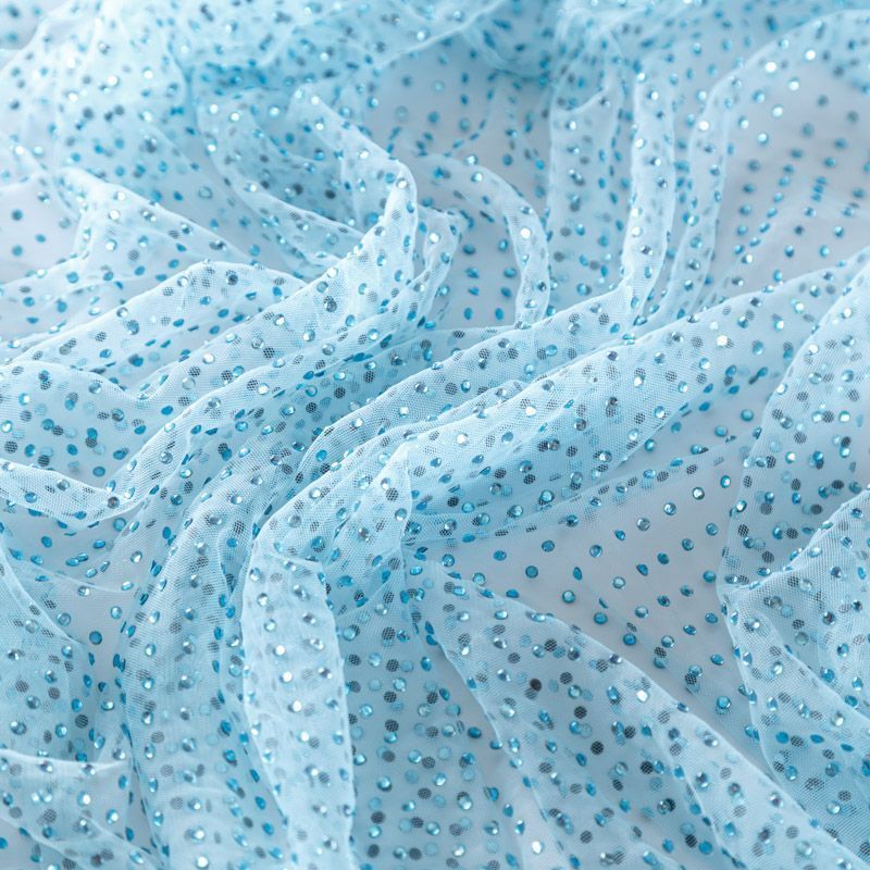 Тонкая прозрачная сетка средней жесткости голубого оттенка декорирована клеевыми стразами в тон полотна. Используется для пошива одежды для различных праздников, концертов, пышных юбок, платьев, а также для отделки и украшения, создания предметов декора и украшения помещений для торжественных мероприятий.