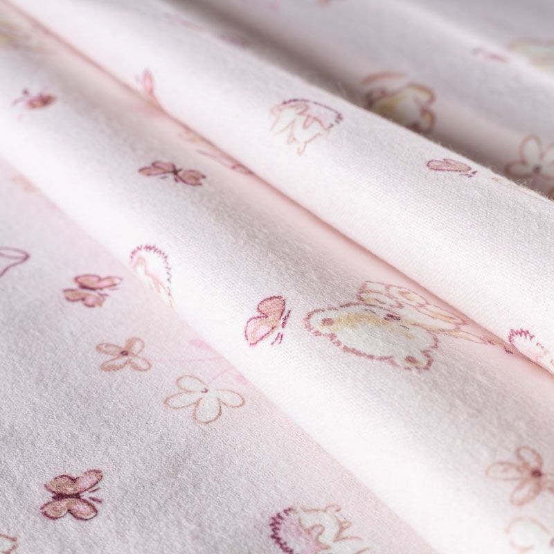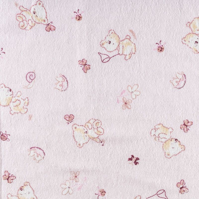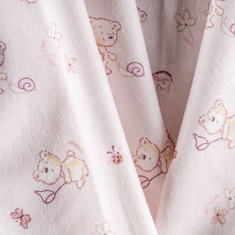 Износостойкий мягкий материал, не раздражает кожу, не садится, отлично впитывает влагу и хорошо удерживает тепло. На лицевой стороне мягкий ворс. Милый детский принт в виде рисованных мишек на нежном розовом фоне прекрасно подойдет для пошива постельного белья, изготовления пеленок, бортиков для кроватки, домашней одежды, пижамы и других предметов интерьера.