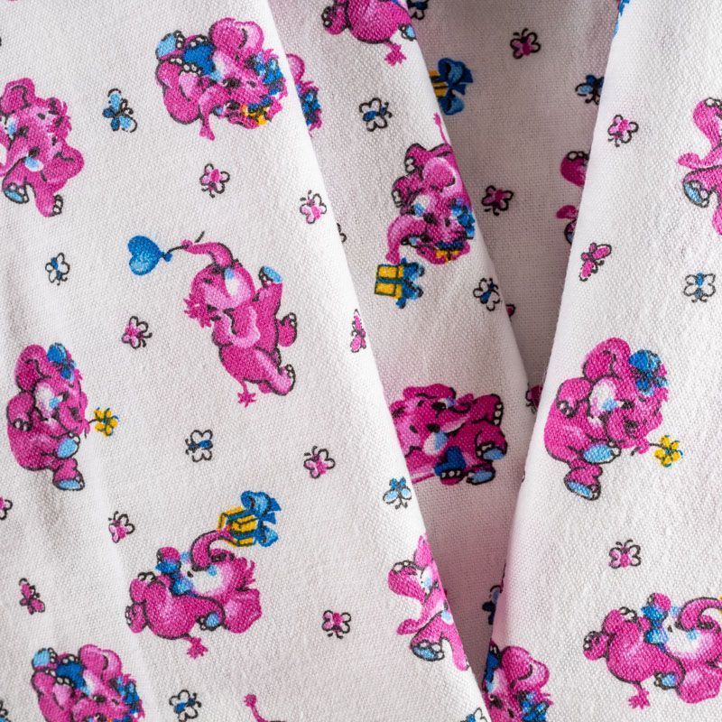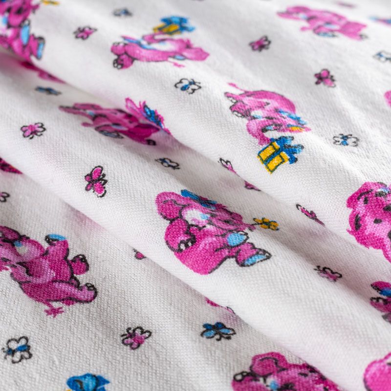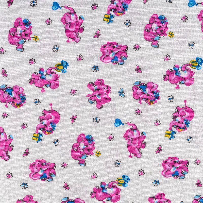 Износостойкий мягкий материал, не раздражает кожу, не садится, отлично впитывает влагу и хорошо удерживает тепло. На внутренней стороне короткий мягкий ворс. Милый детский принт в виде рисованных розовых слоников на белом фоне прекрасно подойдет для пошива постельного белья, изготовления пеленок, бортиков для кроватки, домашней одежды, пижамы и других предметов интерьера.