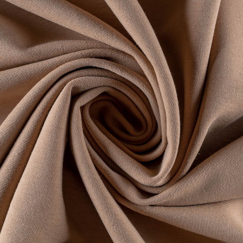 Плотный, но мягкий эластичный трикотаж. Лицевая сторона гладкая, без блеска, мелкой вязки. Изнанка – с небольшим однородным ворсом или петля. Прекрасный вариант для пошива платьев и костюмов, легких толстовок, свитшотов, спортивной, детской и  домашней одежды.