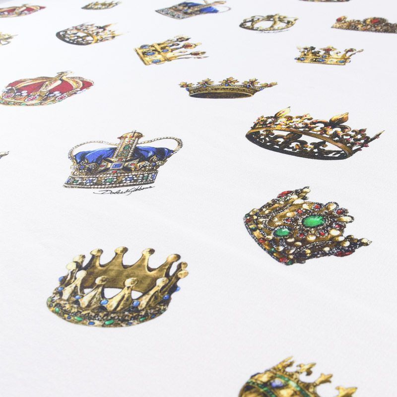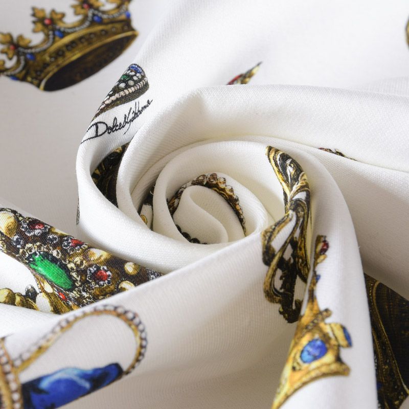 Итальянский брендовый футер с "королевским" принтом на белом фоне. Материал гладкий с лицевой стороны, с изнаночной стороны нанесен трикотажный тонкий дублерин, который дает стабильность полотну и держит форму изделий. Ткань мягкая и комфортная, достаточно эластичная, пластичная. Хорошо садится по фигуре. Практически не мнется. После растяжения быстро возвращается к прежней форме. Подойдет для пошива бомбера, легкого пальто, толстовки, спортивного костюма, джоггеров, шорт, свитшота, кроп-топа, платья в спортивном стиле.