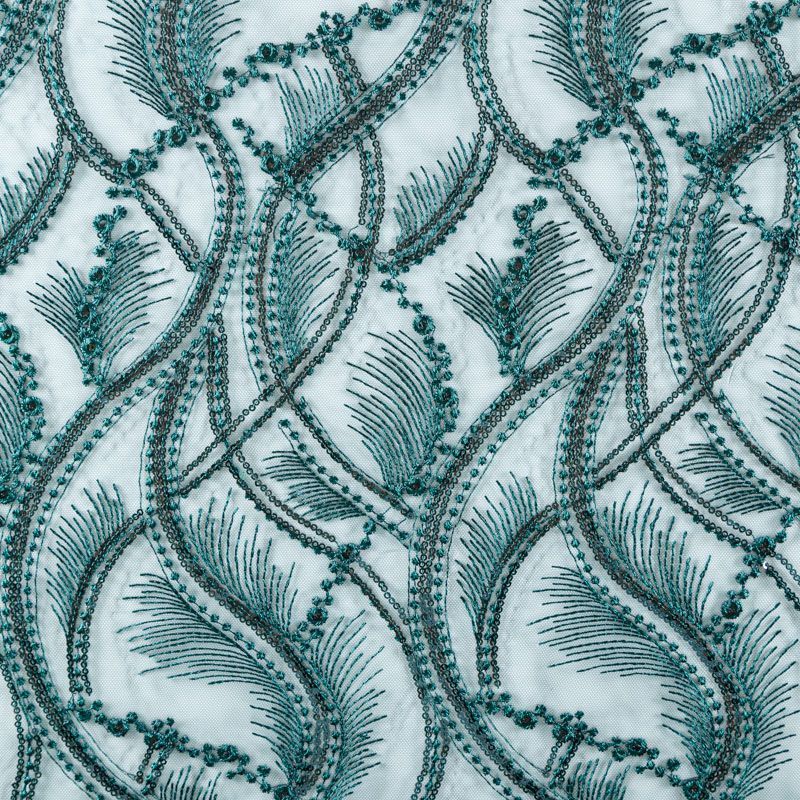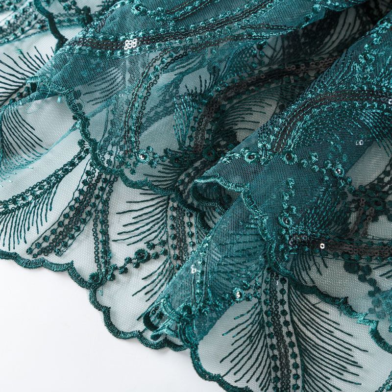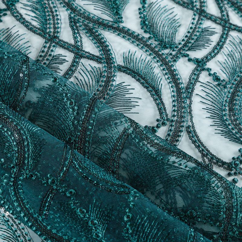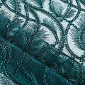 Кружевное полотно на сетчатой основе темно-зеленого оттенка с абстрактным узором, расположенным по ширине ткани. Тонкое, легкое, очень мягкое и пластичное, хорошо драпируется, приятное тактильно. Вышивка дополнена глянцевыми пайетками в тон. С обеих сторон ткань украшена симметричными фестонами, что придает полотну законченный и нарядный вид. Великолепно будет смотреться в нарядном вечернем, свадебном платье, платье на выпускной бал, в юбках, блузках, топах. На изделие набирается объемом.