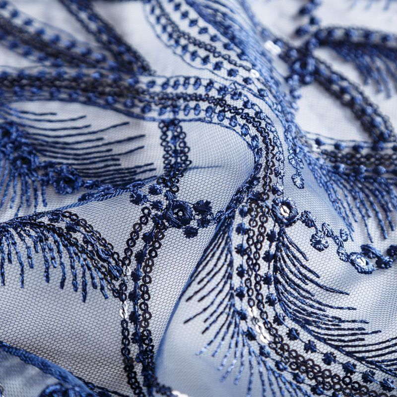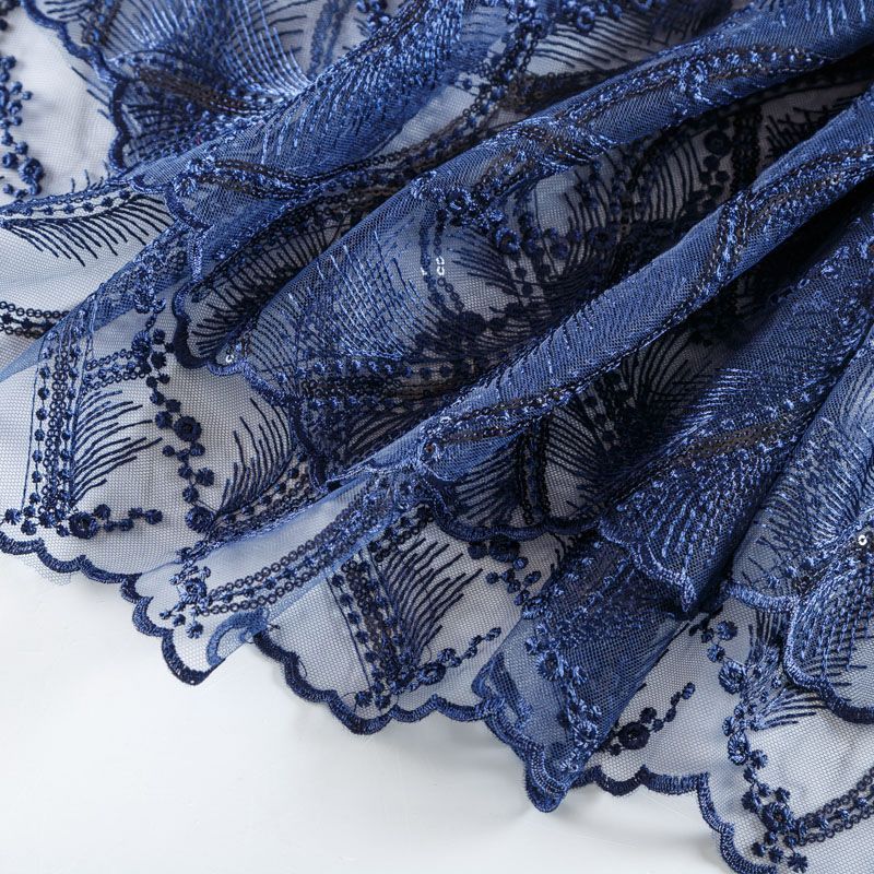 Кружевное полотно на сетчатой основе темно-синего оттенка с абстрактным узором, расположенным по ширине ткани. Тонкое, легкое, очень мягкое и пластичное, хорошо драпируется, приятное тактильно. Вышивка дополнена глянцевыми пайетками в тон. С обеих сторон ткань украшена симметричными фестонами, что придает полотну законченный и нарядный вид. Великолепно будет смотреться в нарядном вечернем, свадебном платье, платье на выпускной бал, в юбках, блузках, топах. На изделие набирается объемом.