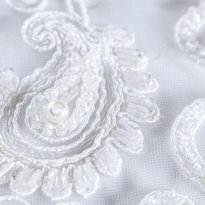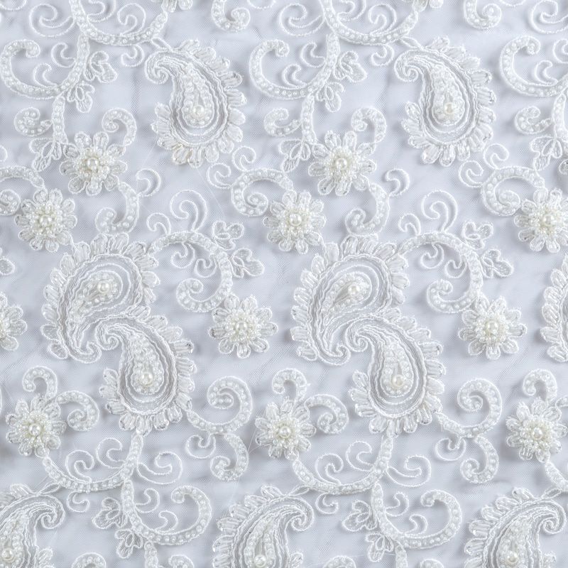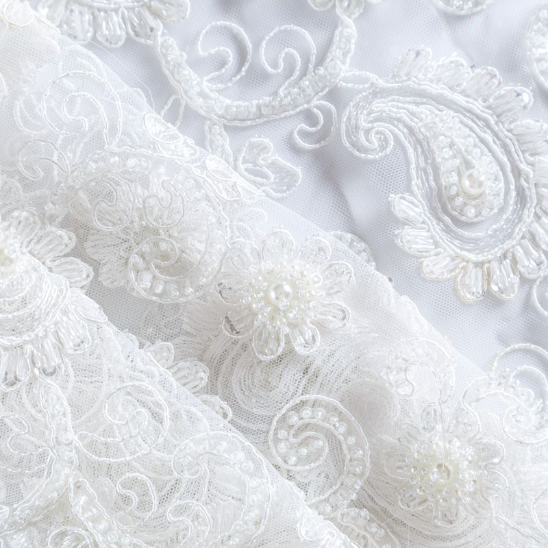 Вышивка на сетке молочного оттенка с флористическим узором. Полотно мягкое, легкое и пластичное, хорошо тянется. Сетка не жесткая, приятная к телу. Узор вышит мягкой пряжей, образуя красивую фактуру, имитирующую ручную вышивку, и оформлен бисером и стеклярусом. С обеих сторон ткань украшена симметричными фестонами, что придает полотну законченный и нарядный вид. Великолепно будет смотреться в нарядном вечернем платье, платье на выпускной бал, в блузках, топах. Набирается для изделия объемом.