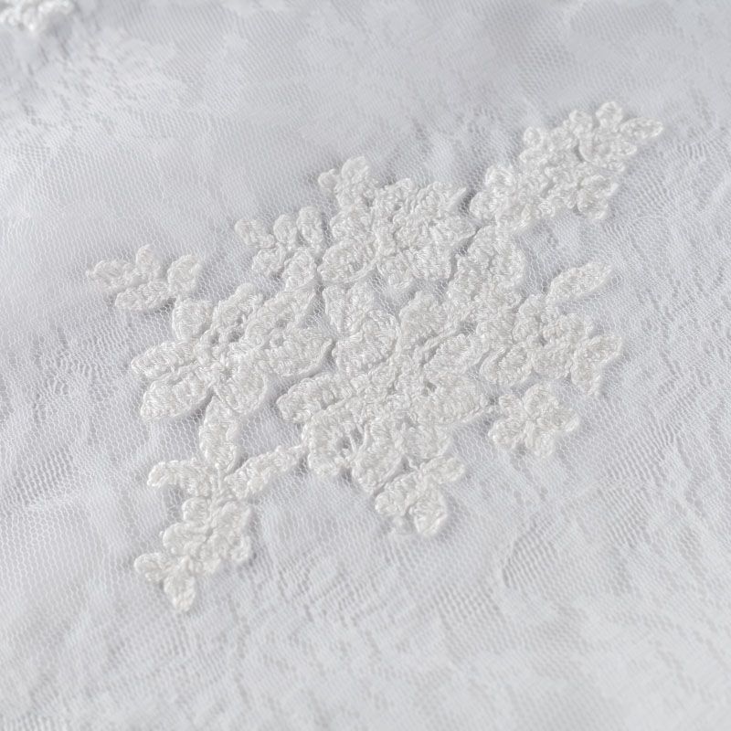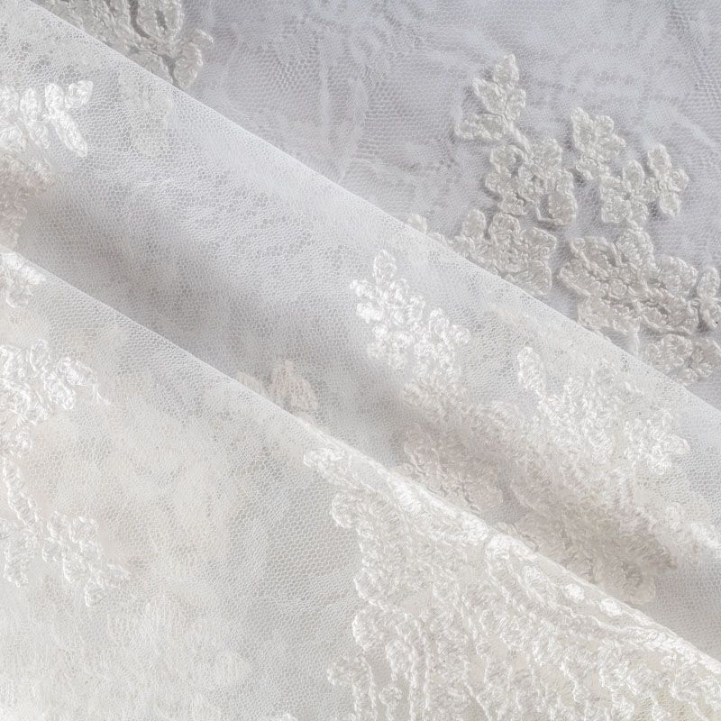 Итальянский гипюр с воздушным кружевным орнаментом, который соединяет прозрачная тонкая сетка молочного оттенка. Вышивка выполнена вискозной нитью не очень плотно, поэтому полотно тонкое, легкое, очень мягкое и пластичное, хорошо драпируется, приятное тактильно. С обеих сторон ткань украшена симметричными фестонами, что придает ей законченный и нарядный вид. Великолепно будет смотреться в нарядном вечернем, свадебном платье, платье на выпускной бал, в юбках, блузках, топах.