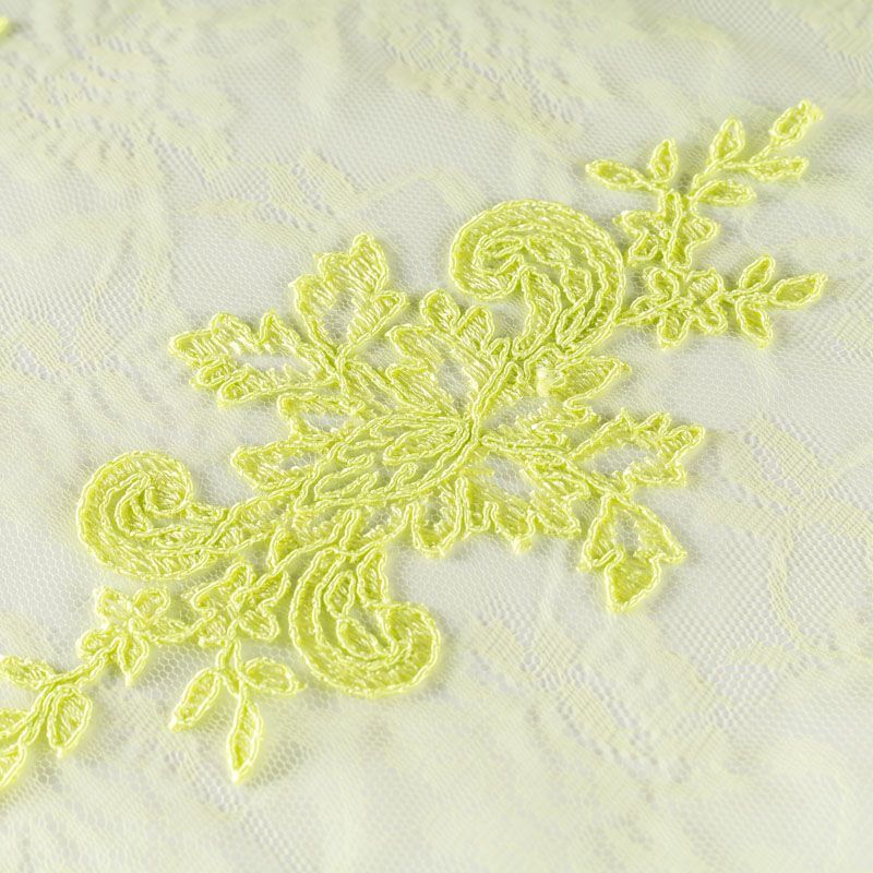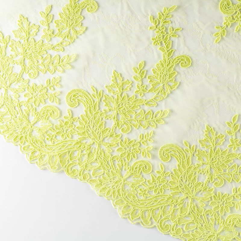 Кружевное полотно на сетчатой жаккардовой основе яркого лаймового неонового оттенка с флористическим узором. Тонкое, легкое, очень мягкое и пластичное, хорошо драпируется, приятное тактильно. Вышивка оформлена кордовой нитью. С обеих сторон ткань украшена симметричными фестонами, что придает полотну законченный и нарядный вид. Великолепно будет смотреться в нарядном вечернем, свадебном платье, платье на выпускной бал, в юбках, блузках, топах. Также можно применять отдельные элементы для декора, которые вырезаются из полотна.