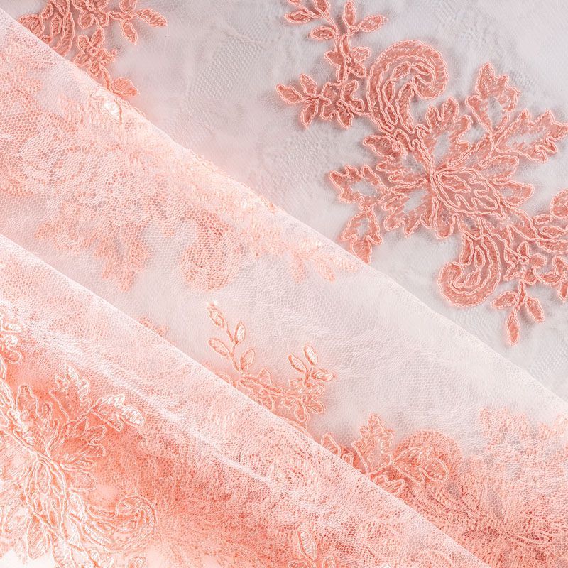 Кружевное полотно на сетчатой жаккардовой основе персиково-розового оттенка с флористическим узором. Тонкое, легкое, очень мягкое и пластичное, хорошо драпируется, приятное тактильно. Вышивка оформлена кордовой нитью. С обеих сторон ткань украшена симметричными фестонами, что придает полотну законченный и нарядный вид. Великолепно будет смотреться в нарядном вечернем, свадебном платье, платье на выпускной бал, в юбках, блузках, топах. Также можно применять отдельные элементы для декора, которые вырезаются из полотна.