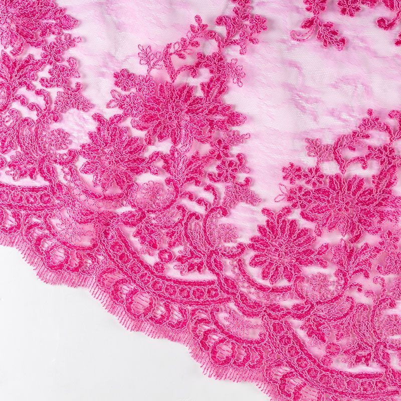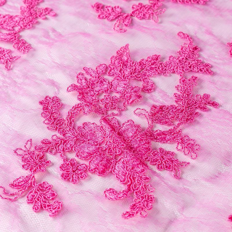 Кружевное полотно на сетчатой жаккардовой основе яркого цвета фуксии с флористическим узором. Тонкое, легкое, очень мягкое и пластичное, хорошо драпируется, приятное тактильно. Вышивка оформлена кордовой нитью. С обеих сторон ткань украшена симметричными фестонами, что придает полотну законченный и нарядный вид. Великолепно будет смотреться в нарядном вечернем, свадебном платье, платье на выпускной бал, в юбках, блузках, топах. Также можно применять отдельные элементы для декора, которые вырезаются из полотна.