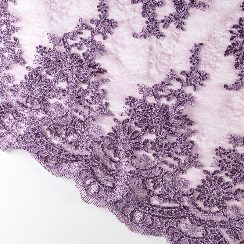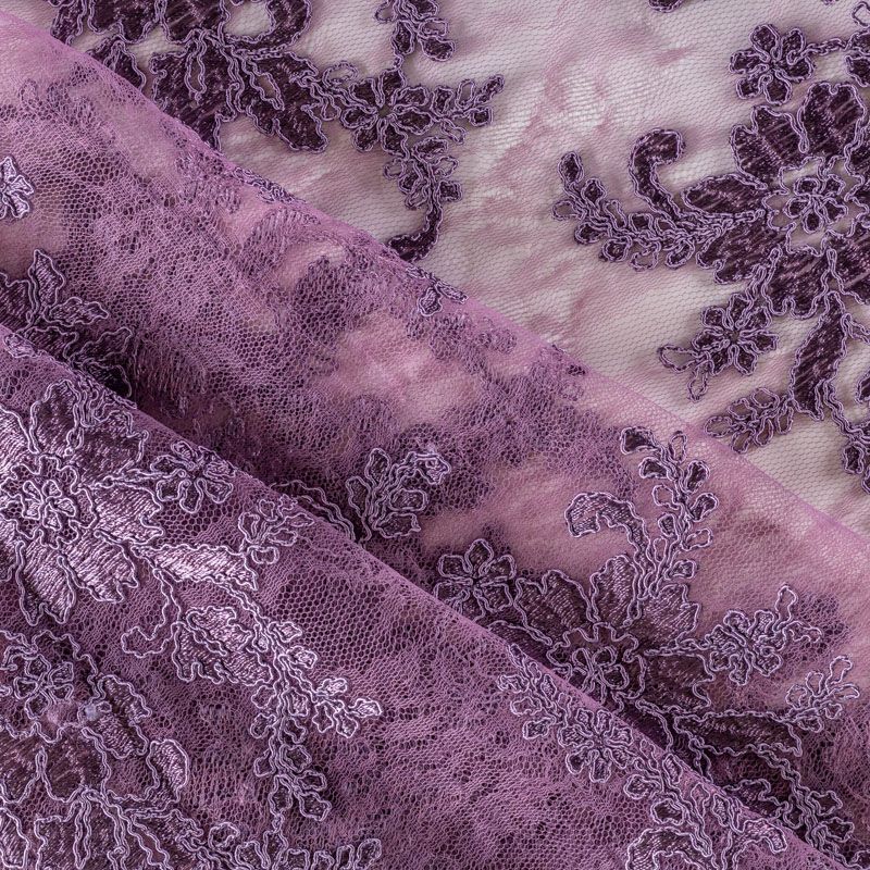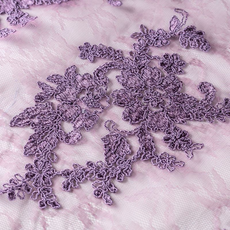 Кружевное полотно на сетчатой жаккардовой основе сиреневого оттенка с флористическим узором. Тонкое, легкое, очень мягкое и пластичное, хорошо драпируется, приятное тактильно. Вышивка оформлена кордовой нитью. С обеих сторон ткань украшена симметричными фестонами, что придает полотну законченный и нарядный вид. Великолепно будет смотреться в нарядном вечернем, свадебном платье, платье на выпускной бал, в юбках, блузках, топах. Также можно применять отдельные элементы для декора, которые вырезаются из полотна.