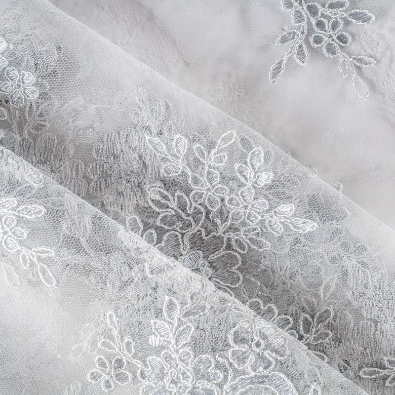 Кружевное полотно на сетчатой жаккардовой основе жемчужного оттенка с флористическим узором. Тонкое, легкое, очень мягкое и пластичное, хорошо драпируется, приятное тактильно. Вышивка оформлена кордовой нитью. С обеих сторон ткань украшена симметричными фестонами, что придает полотну законченный и нарядный вид. Великолепно будет смотреться в нарядном вечернем, свадебном платье, платье на выпускной бал, в юбках, блузках, топах. Также можно применять отдельные элементы для декора, которые вырезаются из полотна.