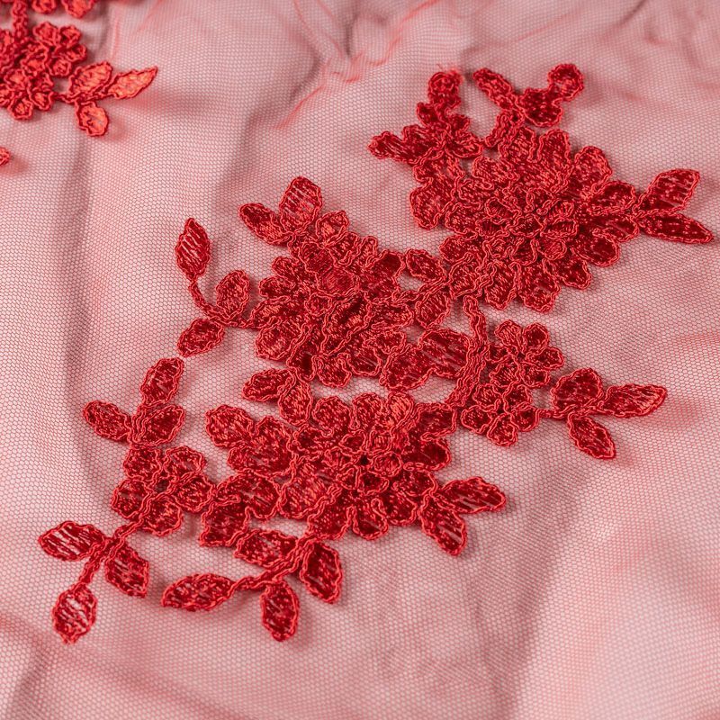 Вышивка на сетке насыщенного красного оттенка с флористическим узором. Полотно мягкое, легкое и пластичное, хорошо тянется. Сетка не жесткая, приятная к телу. Узор вышит мягкой пряжей, образуя красивую фактуру, имитирующую ручную вышивку, и оформлен кордовой нитью. С обеих сторон ткань украшена симметричными фестонами, что придает полотну законченный и нарядный вид. Великолепно будет смотреться в нарядном вечернем платье, платье на выпускной бал, в блузках, топах. Набирается для изделя объемом.