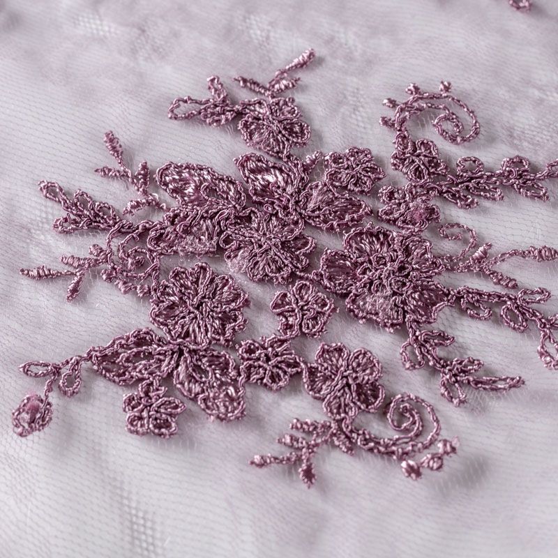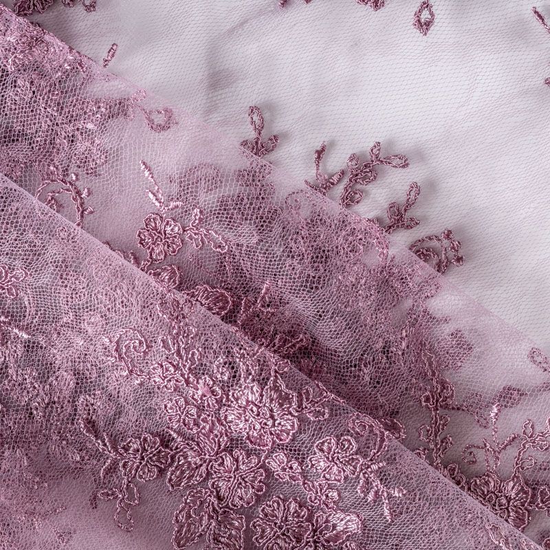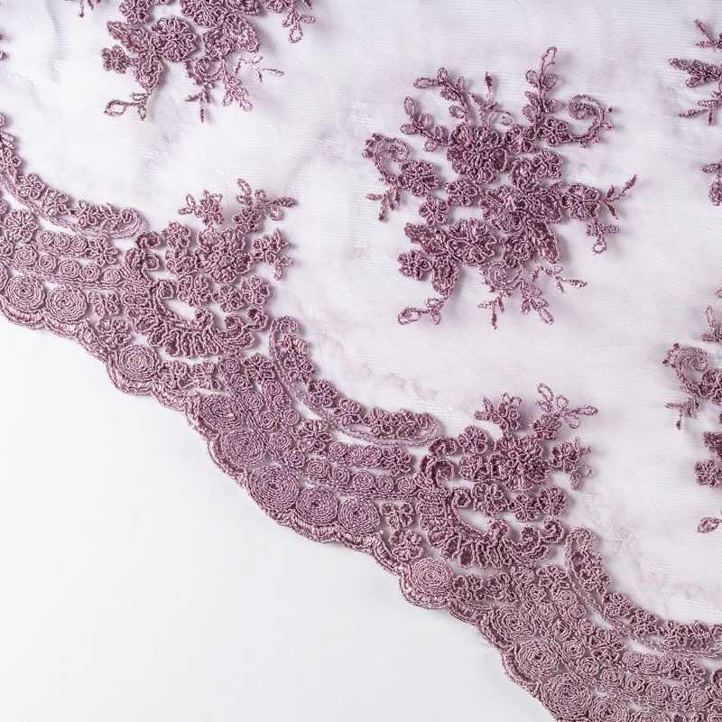 Кружевное полотно на сетчатой жаккардовой основе сложного сочетания розового и лилового оттенков с флористическим узором. Тонкое, легкое, очень мягкое и пластичное, хорошо драпируется, приятное тактильно. Вышивка оформлена кордовой нитью. С обеих сторон ткань украшена симметричными фестонами, что придает полотну законченный и нарядный вид. Великолепно будет смотреться в нарядном вечернем, свадебном платье, платье на выпускной бал, в юбках, блузках, топах. Также можно применять отдельные элементы для декора, которые вырезаются из полотна.