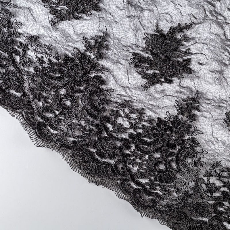 Кружевное полотно на сетчатой жаккардовой основе элегантного черного цвета с флористическим узором. Тонкое, легкое, очень мягкое и пластичное, хорошо драпируется, приятное тактильно. Вышивка оформлена кордовой нитью. С обеих сторон ткань украшена симметричными фестонами, что придает полотну законченный и нарядный вид. Великолепно будет смотреться в нарядном вечернем, свадебном платье, платье на выпускной бал, в юбках, блузках, топах. Также можно применять отдельные элементы для декора, которые вырезаются из полотна.