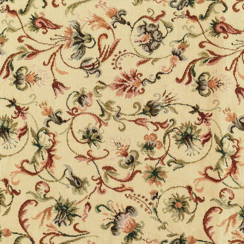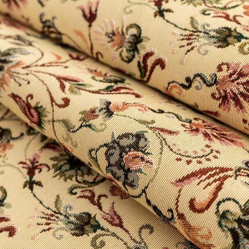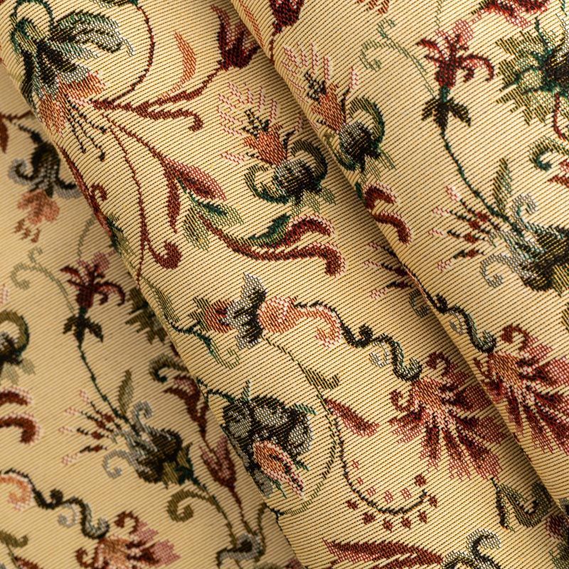 Гобелен представляет собой ткань, выполненную  перекрестным плетением нитей с одномоментным созданием сюжетной или орнаментальной композиции. Это плотный материал высокую прочность и износостойкость. Гобелен используют для пошива плотных светонепроницаемых штор, декоративного домашнего текстиля и аксессуаров, в мебельном производстве для обивки мебели. Так же применяется в рукоделии: модные кошельки, сумочки, пояса и другие аксессуары и при изготовлении дизайнерской одежды. На спокойном песочном фоне цветное разнообразие фантазийных цветов.