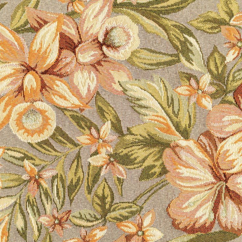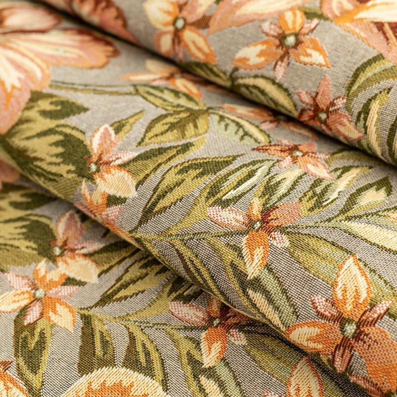 Гобелен представляет собой ткань, выполненную  перекрестным плетением нитей с одномоментным созданием сюжетной или орнаментальной композиции. Это плотный материал высокую прочность и износостойкость. Гобелен используют для пошива плотных светонепроницаемых штор, декоративного домашнего текстиля и аксессуаров, в мебельном производстве для обивки мебели. Так же применяется в рукоделии: модные кошельки, сумочки, пояса и другие аксессуары и при изготовлении дизайнерской одежды. На спокойном светло-сером фоне крупные цветы лилий в розово-персиковых оттенках.