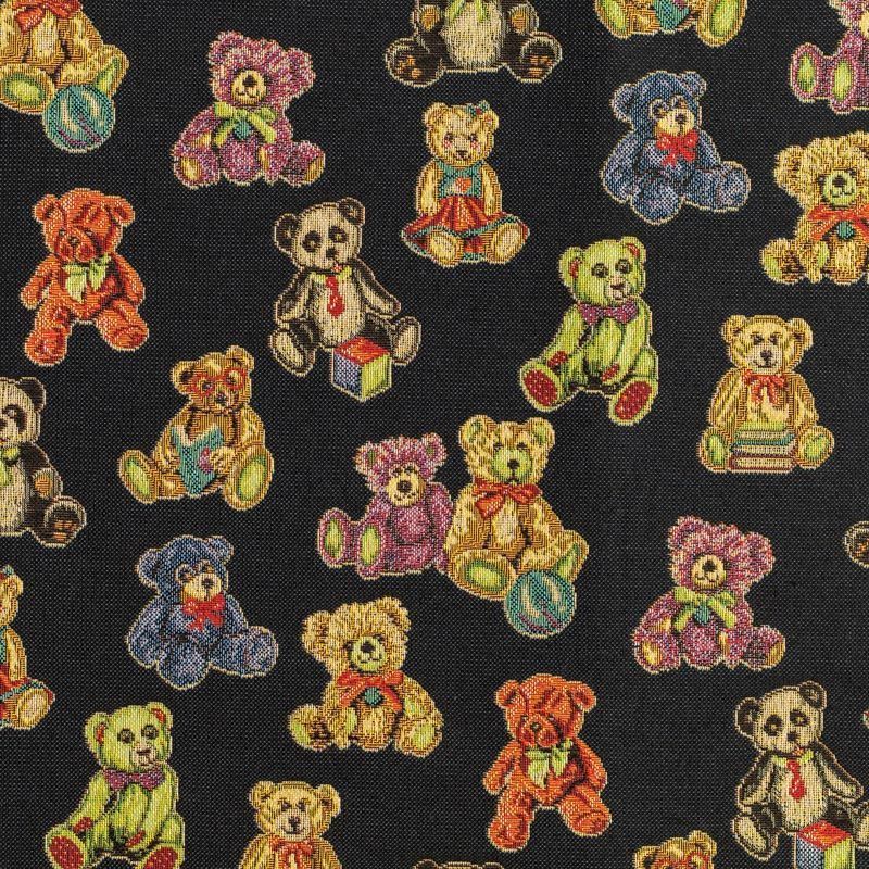 Гобелен представляет собой ткань, выполненную перекрестным плетением нитей с одномоментным созданием сюжетной или орнаментальной композиции. Это плотный материал высокую прочность и износостойкость. Гобелен используют для пошива плотных светонепроницаемых штор, декоративного домашнего текстиля и аксессуаров, в мебельном производстве для обивки мебели. Так же применяется в рукоделии: модные кошельки, сумочки, пояса и другие аксессуары и при изготовлении дизайнерской одежды. На черном фоне всеми любимые разноцветные игрушки - мишки-тедди.