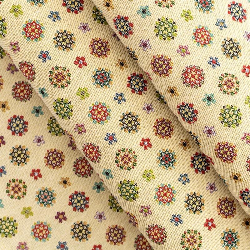 Гобелен представляет собой ткань, выполненную  перекрестным плетением нитей с одномоментным созданием сюжетной или орнаментальной композиции. Это плотный материал высокую прочность и износостойкость. Гобелен используют для пошива плотных светонепроницаемых штор, декоративного домашнего текстиля и аксессуаров, в мебельном производстве для обивки мебели. Так же применяется в рукоделии: модные кошельки, сумочки, пояса и другие аксессуары и при изготовлении дизайнерской одежды. На спокойном песочном фоне цветное разнообразие ажурных снежинок.