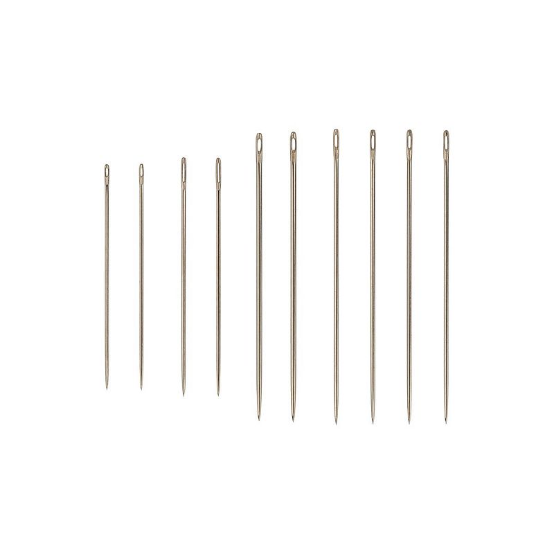 Набор игл для ручного шитья, наметки. Иглы сделаны из высокоуглеродистой стали с идеальной гладкой поверхностью и никелированным покрытием, которое защищает иглу от коррозии и окисления. Ушки внутри игл отполированы и не имеют зацепок, поэтому нить не будет рваться при работе. Размер игл: 0.76x41.5 - 2шт; 0.71x39 - 2шт; 0.84x51 - 4шт; 1.09x50 - 2шт.
